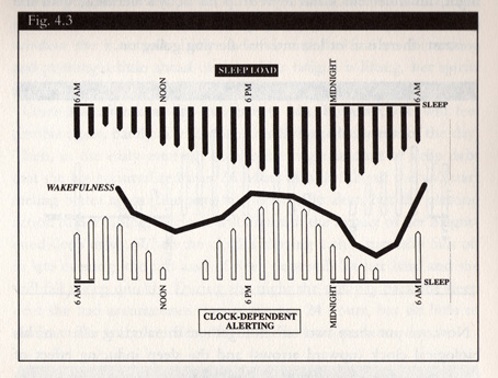 This model is based on individuals sleeping for eight hours at night – from 10 p.m. until 6 a.m. But what if that individual took a nap in the middle of the day? Her sleep need would decrease accordingly and start to rise again. At bedtime, her sleep need would be less, but still enough to get to sleep. Or, if she slept in two four-hour blocks throughout the day, the need would be more balanced, and never so great that her urge overtakes her need – she wouldn’t just spontaneously fall asleep while in a meeting or driving home.