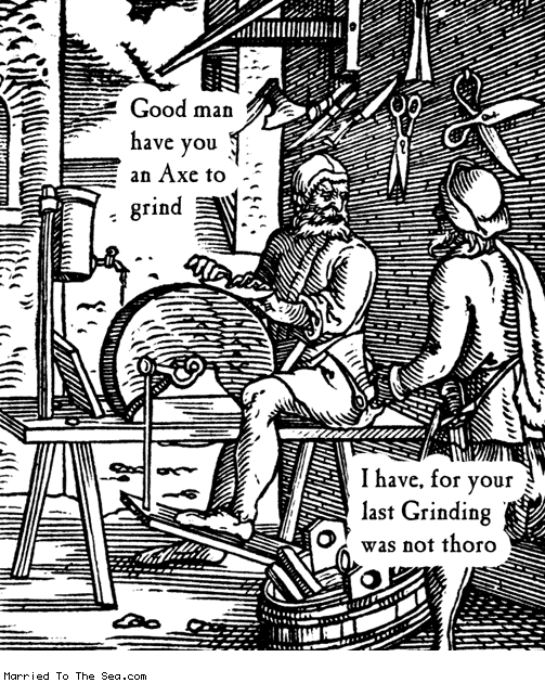 A man comes to get his ax ground, sometime in the Middle Ages? (From Married to the Sea)